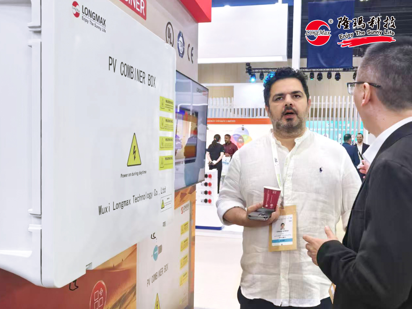 在展會上,隆瑪新一代DC2000V光伏系統(tǒng)智能匯流箱一經(jīng)亮相便以創(chuàng)新設(shè)計與卓越性能牢牢鎖住諸多參觀者的目光,成為現(xiàn)場TOP級“流量明星”。從傳統(tǒng)DC1500V升級到DC2000V,隆瑪DC2000V光伏智能匯流箱在輸入輸出電壓性能上實現(xiàn)了顯著提升,系統(tǒng)傳輸損耗更是銳減至0.5%,從而大幅提高了整個能源系統(tǒng)的轉(zhuǎn)換與傳輸效率。同時,其全新的大箱體設(shè)計,配合多種先進的自動檢測、關(guān)斷功能以及智能通信運維功能,不僅滿足了更高等級的防護要求,更能穩(wěn)健地應(yīng)對沙漠環(huán)境中各種極端惡劣條件。