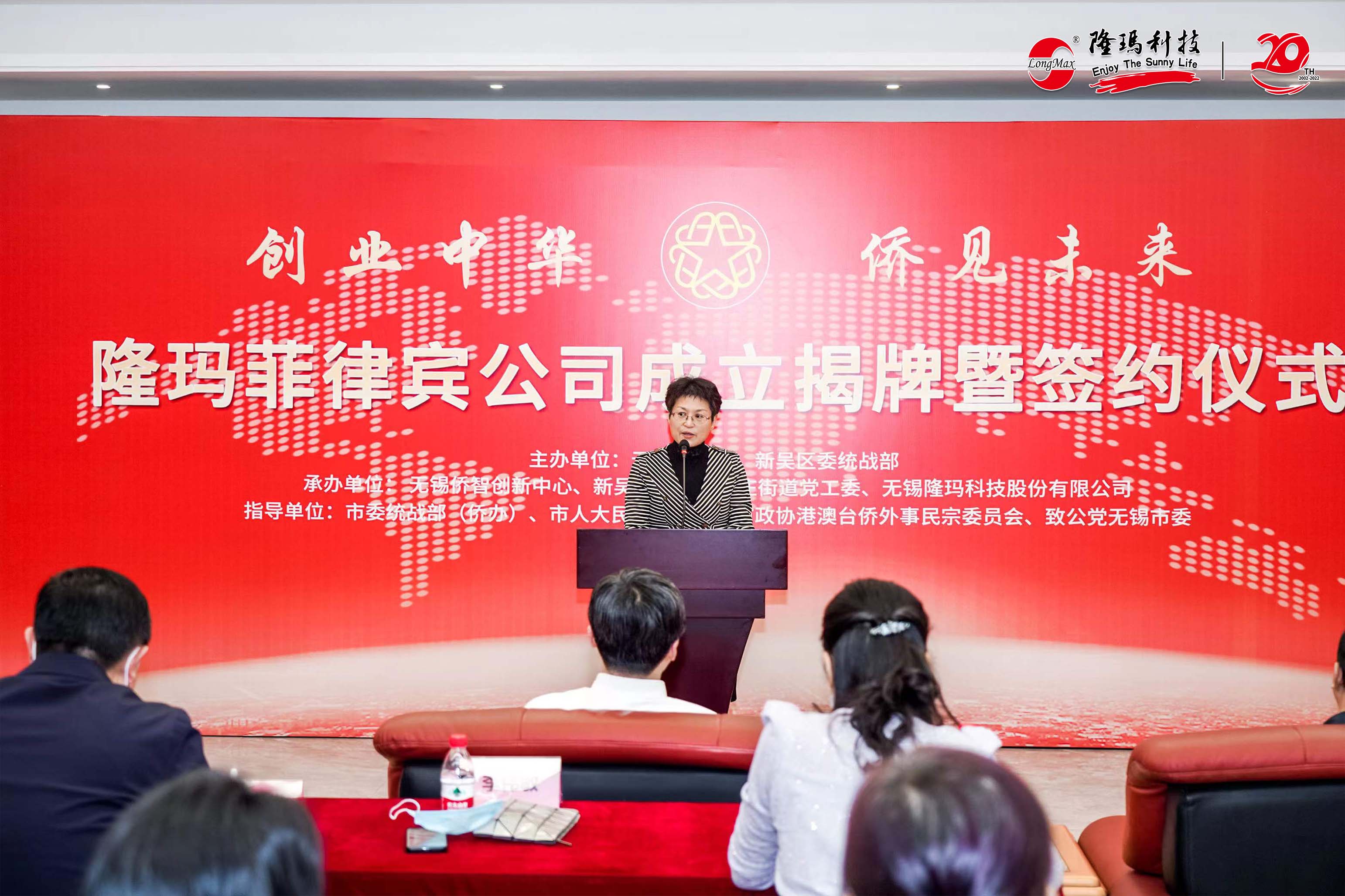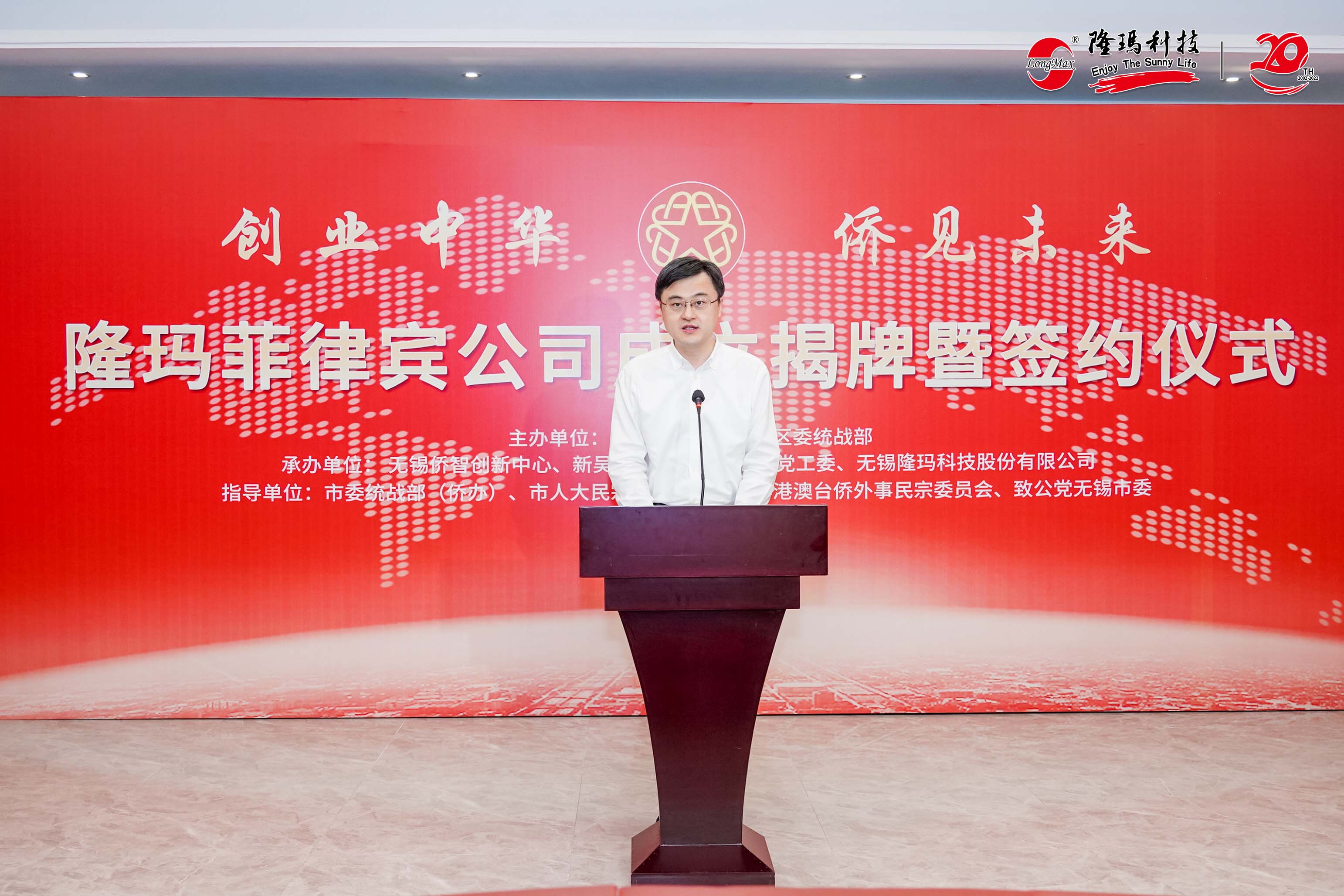 無錫市委常委、統(tǒng)戰(zhàn)部部長周常青;市人大副主任高亞光;市政協(xié)副主席、致公黨主委吳紅星;無錫市僑聯(lián)黨組書記、主席李濤;新吳區(qū)區(qū)委常委、統(tǒng)戰(zhàn)部部長李偉敏;隆瑪科技董事長楊朝輝、總經(jīng)理?xiàng)钣钶x以及市委組織部、市“五僑”的領(lǐng)導(dǎo)、市級機(jī)關(guān)僑聯(lián)、市僑聯(lián)下屬群團(tuán)、新吳區(qū)僑聯(lián)、旺莊街道、僑智中心的領(lǐng)導(dǎo)、隆瑪公司高管、菲律賓公司全權(quán)代表等出席本次活動。