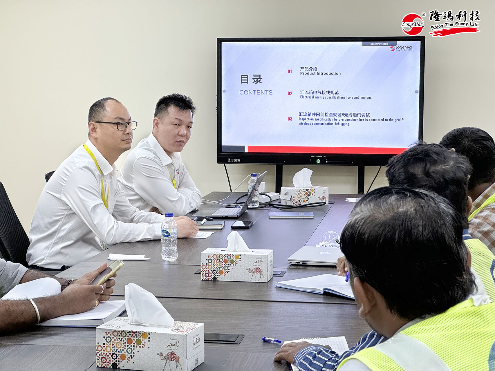 隨后,在持續(xù)高溫的“蒸烤”模式下團(tuán)隊(duì)轉(zhuǎn)戰(zhàn)阿聯(lián)酋迪拜東北部的DEVA VI項(xiàng)目,為當(dāng)?shù)?/span>L&T公司團(tuán)隊(duì)帶來詳盡的接線規(guī)范培訓(xùn),并針對(duì)當(dāng)?shù)?/span>極端氣候環(huán)境制定了特殊施工維護(hù)方案。