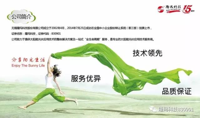 無錫隆瑪科技股份有限公司成立于2002年4月,2014年7月25日成功在新三板掛牌上市,2014年8月15日,成立全資子公司——無錫隆瑪新能源有限公司。公司為江蘇省高新技術(shù)企業(yè),被授予“江蘇省太陽能光伏應(yīng)用工程技術(shù)研發(fā)中心”和“無錫市工程技術(shù)中心”稱號。目前已累計擁有江蘇省高新技術(shù)產(chǎn)品5項,各類專利80余項。公司提供“太陽能光伏應(yīng)用整體解決方案”,以“分享陽光生活”為愿景,秉承“國際化、專業(yè)化”的戰(zhàn)略,以“技術(shù)創(chuàng)新、品質(zhì)保障、服務(wù)優(yōu)異”為企業(yè)發(fā)展基石,竭誠為用戶服務(wù),為推動綠色清潔可再生能源及光伏行業(yè)的發(fā)展而努力。